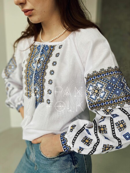 Легка жіноча біла вишиванка з геометричним орнаментом в синіх відтінках “Либідь”