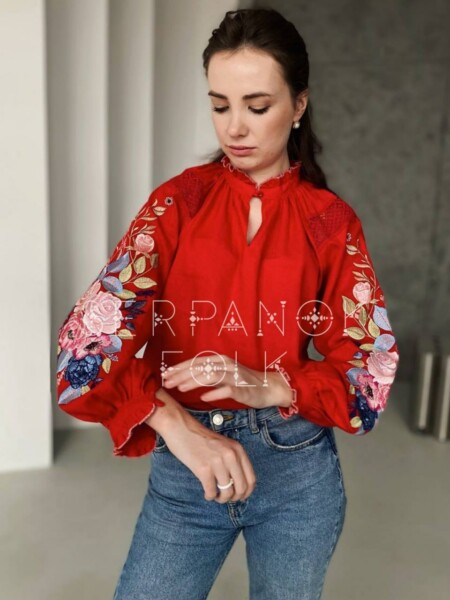 Яскрава червона жіноча вишита блуза з трояндами на лляній тканині “Корделія”