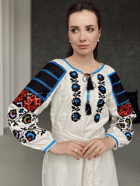 Офісна біла квіткова жіноча вишита блуза з трояндами “Корделія”