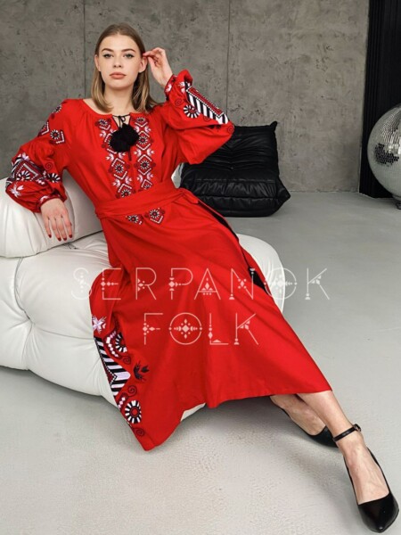 Яскрава жіноча червона вишита сукня з геометричним орнаментом “Любов”