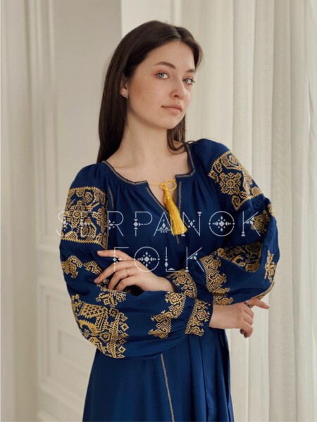Синя вишита сукня на лльняній тканині з золотою вишивкою “Жарптиця”