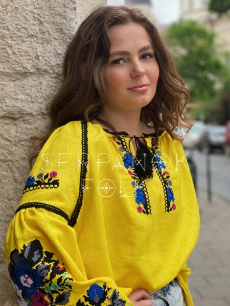Яскрава жовта жіноча вишиванка в стилі бохо на лляній тканині “Маріса”
