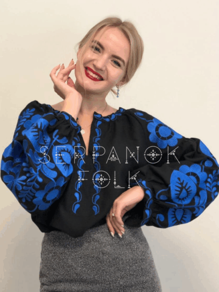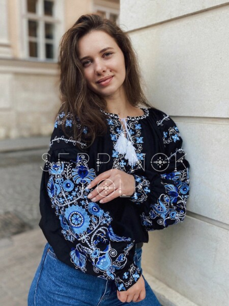 Розкішна чорна жіноча блуза вишиванка бохо з квітковим орнаментом “Адель”