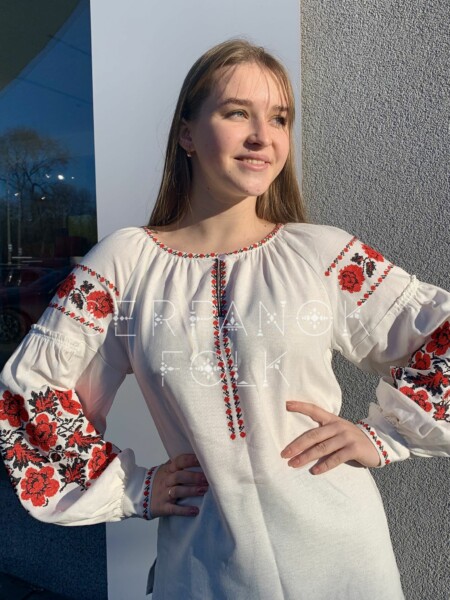 Традиційна біла жіноча вишиванка на лляній тканині з квітами “Червона ружа”